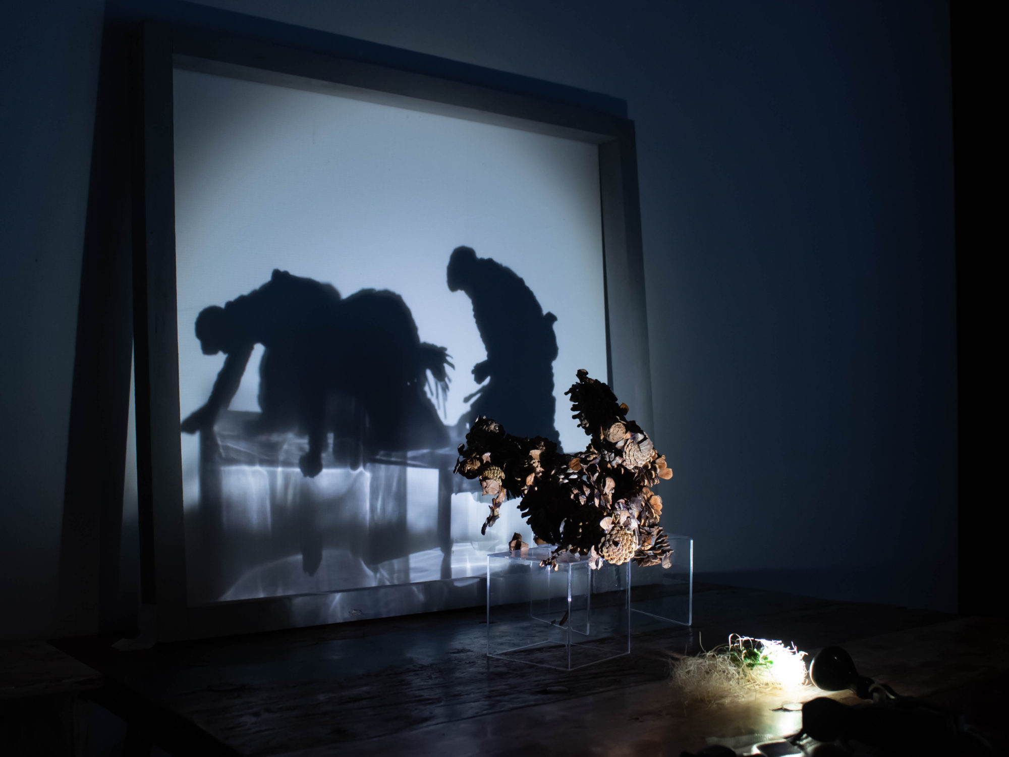 かつては誰かの所有物であったもの達を集めて、光を当てたら浮かび上がる影アートを作りました。